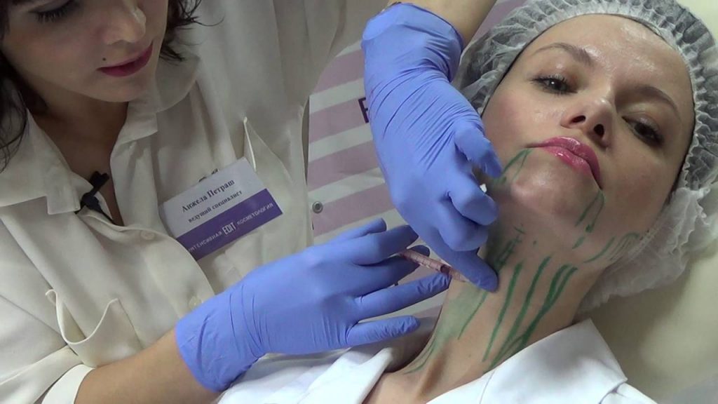 Для подтягивания кожи и обогащения питательными веществами делают курс уколов специальными препаратами. Продолжительность процедуры составляет от 30 минут до 1,5 часа. После уколов рекомендуют некоторое время лежать в горизонтальном положении. Через 2-3 дня можно увидеть эффект от уколов, а через 1 месяц полностью результат, который сохраняется в течение 6 месяцев. Практикуют подтягивание кожного покрова пациенткам возрастом от 30 лет. Уколы ботокса делают женщинам после 40 лет небольшими дозами в проблемные места, которые парализуют мышцы, создавая эффект подтянутости. В первый день побочным действием является трудности с глотания, которые со временем проходят.